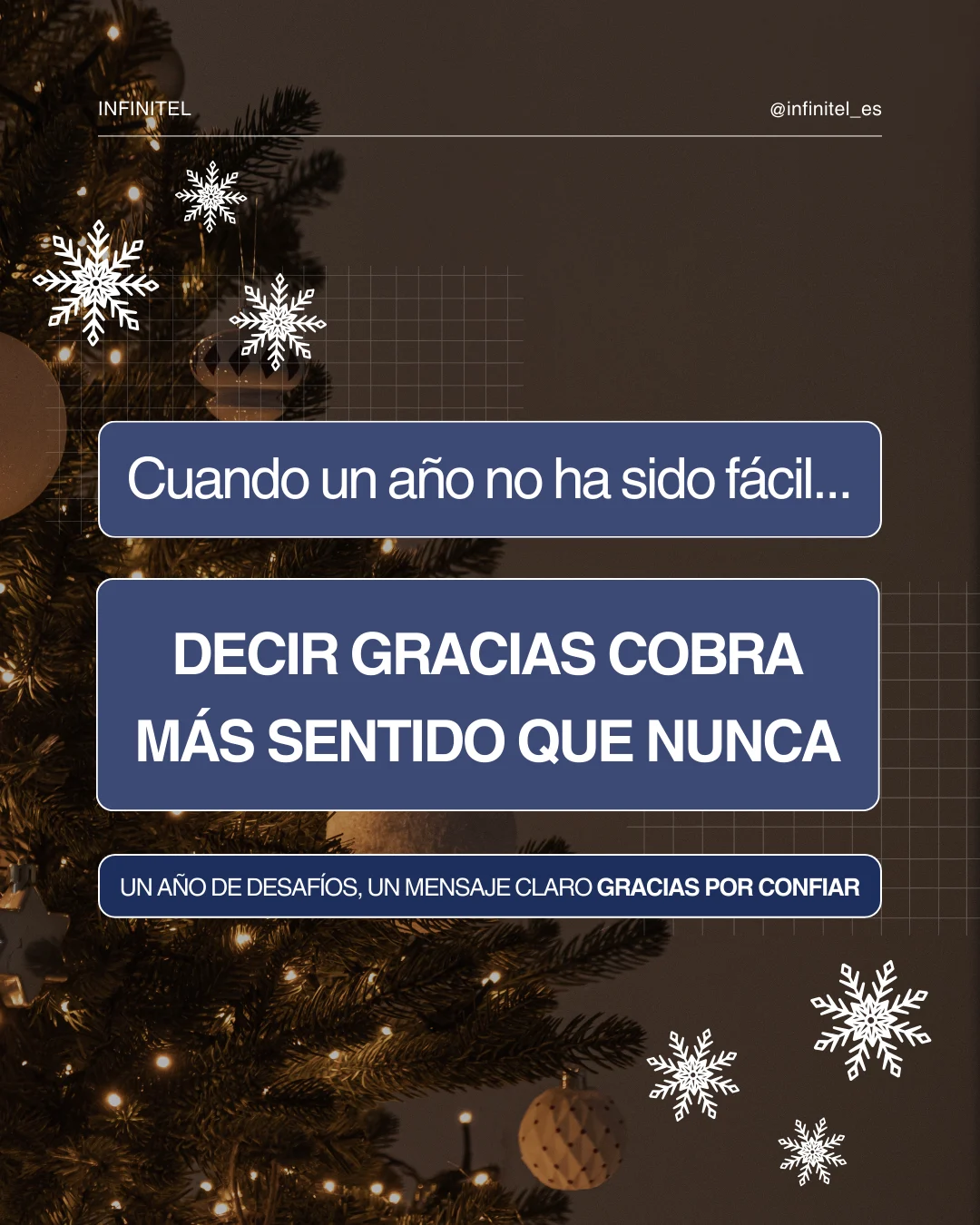 Gracias por acompañarnos un año más. Somos conscientes de que 2025 no ha sido un año fácil, y precisamente por ello queremos agradecerte de forma especial la confianza y el compromiso que has depositado en Infinitel. Ahora es momento de hacer una pausa, disfrutar del descanso y prepararnos para un 2026 que se presenta ilusionante y lleno de retos.